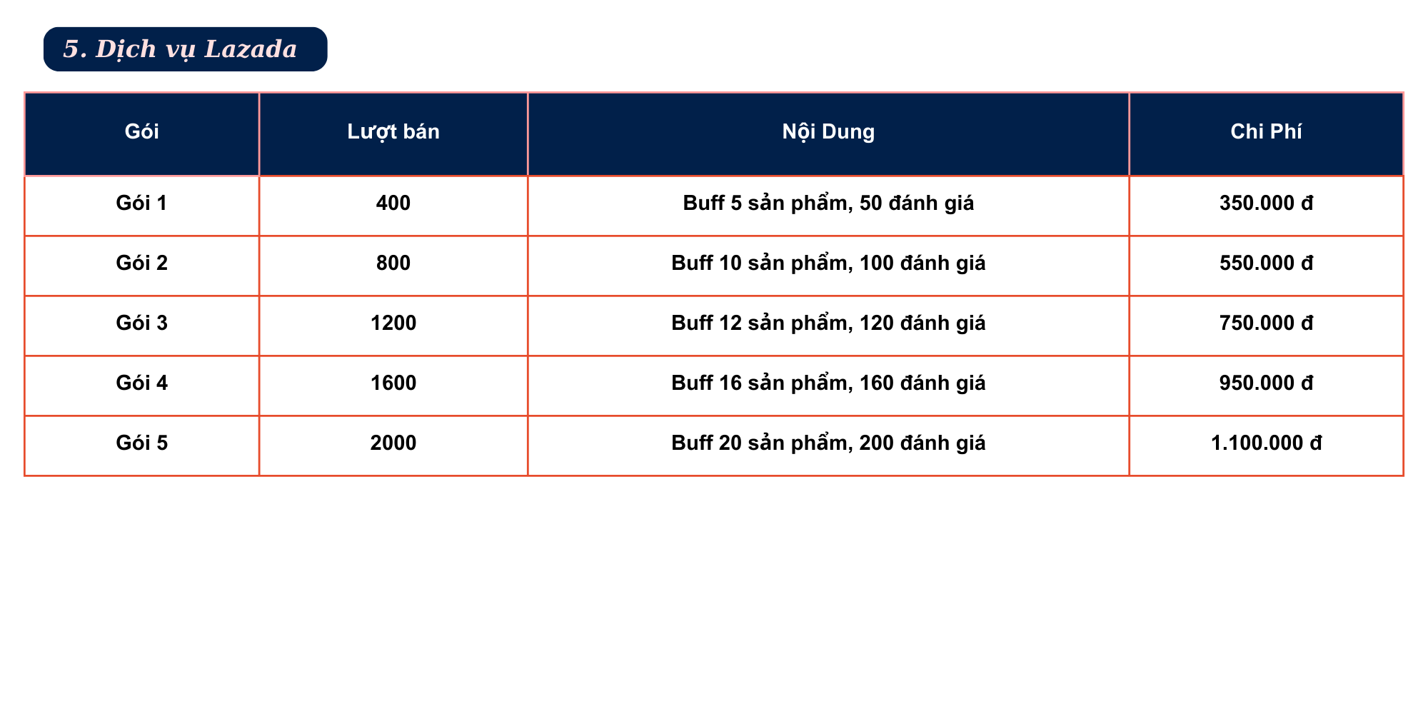 Bảng giá dịch vụ Lazada